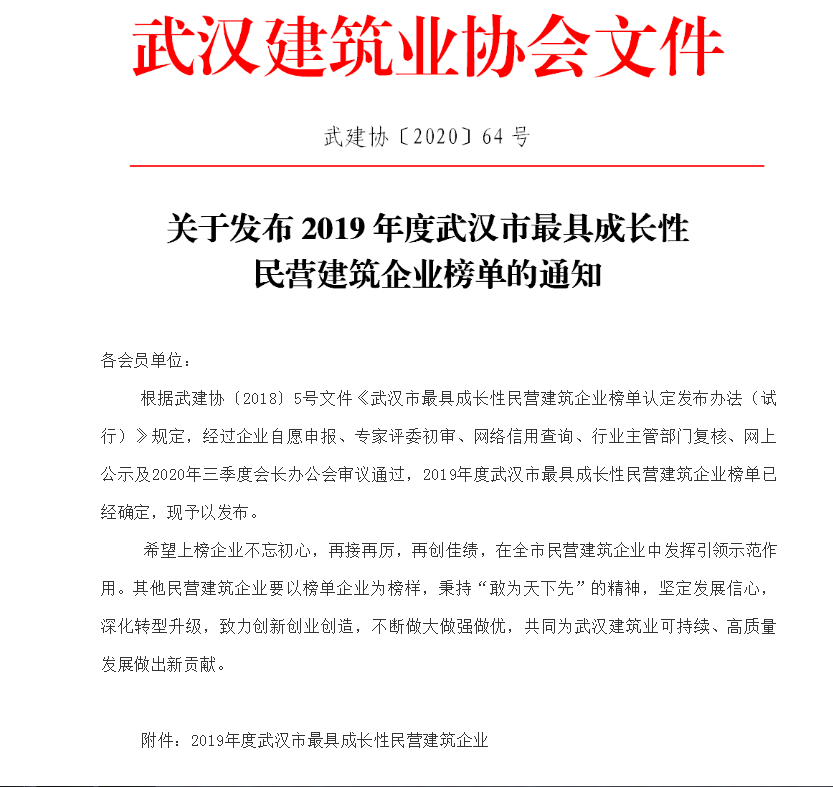 熱烈祝賀武漢科正獲得2019年度武漢市最具成長性民營建筑企業(yè)。